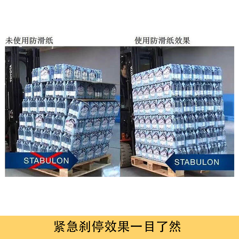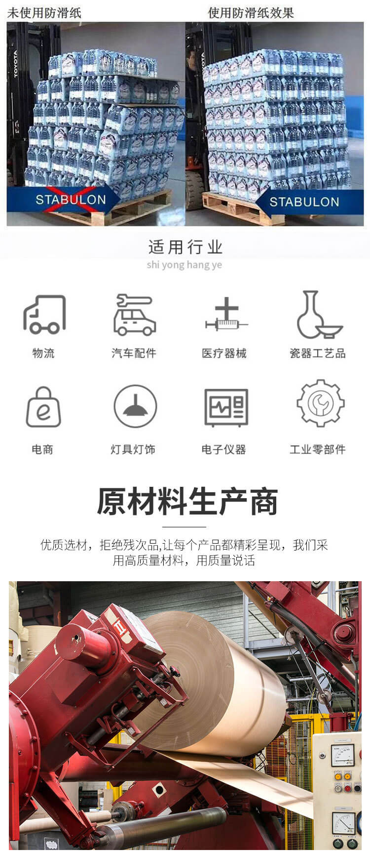 防滑纸适合各种包装的货物堆垛:纸箱、塑料箱、纸袋、玻璃制品、金属制品、橡胶制品、木制品及更多材质的包装。