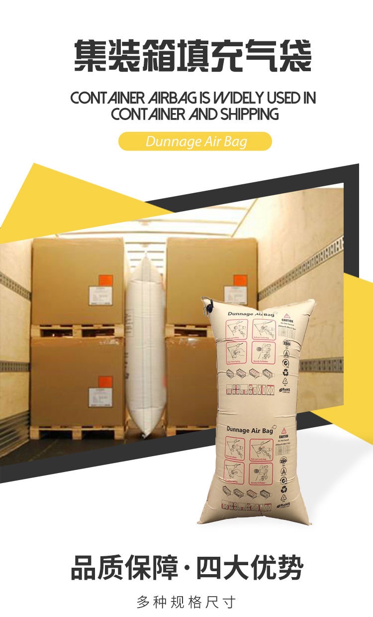 集装箱填充气袋被广泛地应用在集装箱、海运;拖车、火车等各种运输方式中,它的作用是填充货物之间的空隙能够起到缓冲作用,吸取震动从而保护产品不因碰撞受到损坏。能有效地保护运输途中的货物,避免相互碰撞,起到缓冲、防倒塌等作用,特别适用于托盘化、整板、成批运输物流系统托盘化和集装箱化的货物倒塌等问题。对于削减物流成本、提高装卸速度,装载效率等,有很大的效应.更是货物运输中原木材或发泡胶的新型环保替代产品。
