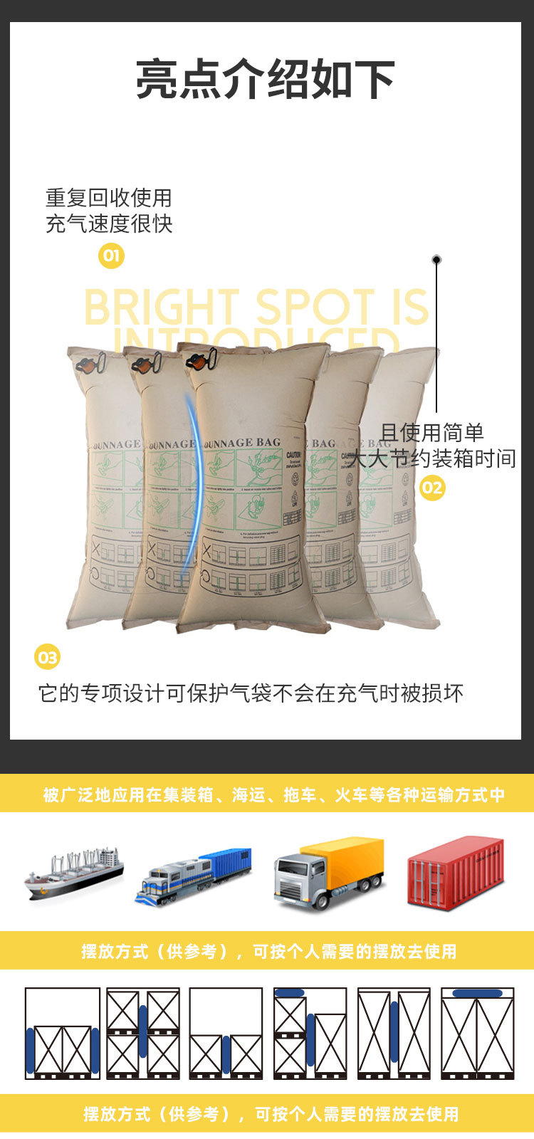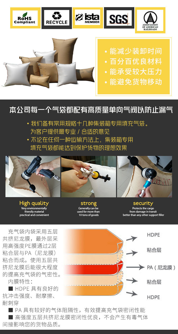 填充气袋的作用是在运输途中防止货物移动, 它可以填充货物与货物之间的空隙,承受货物在摇动时所产生之 重量, 能避免货物在运输过程中有所损坏。