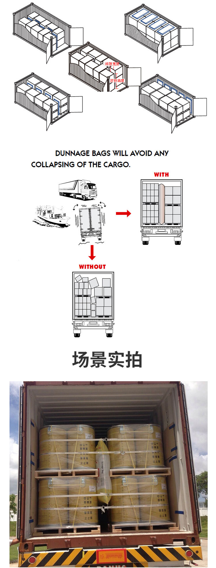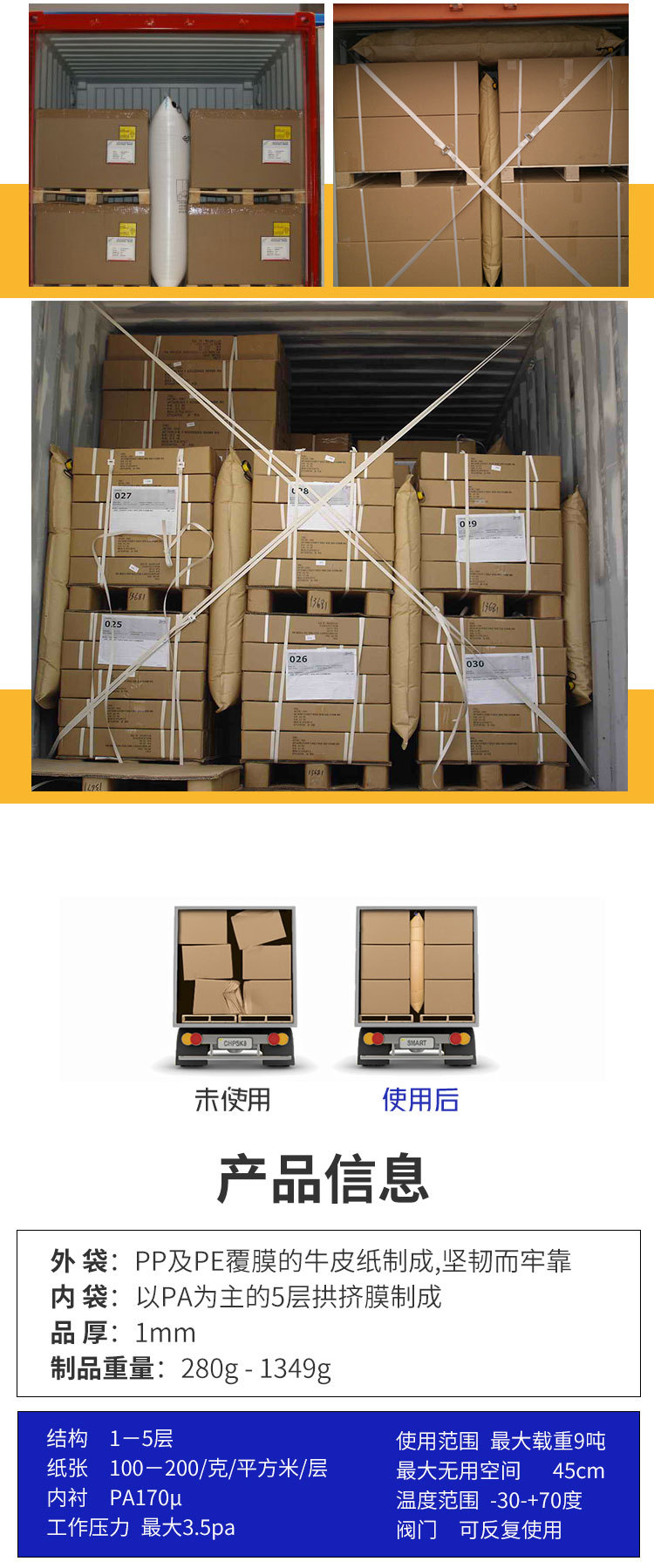 各种运输方法上,集装箱专用填充气袋都能达到保护货物的理想成果
